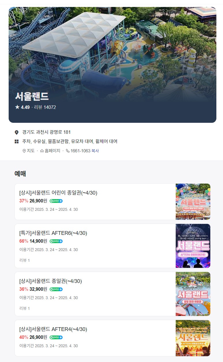 - “서울랜드 입장권” 검색 → 다양한 할인 티켓 확인